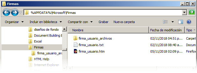 Usuarios de Outlook, deben guardar el archivo .zip en la carpeta %APPDATA%\Microsoft\Firmas (o %APPDATA%\Microsoft\Signatures). Luego deben descomprimir el .zip para obtener los archivos de la firma.